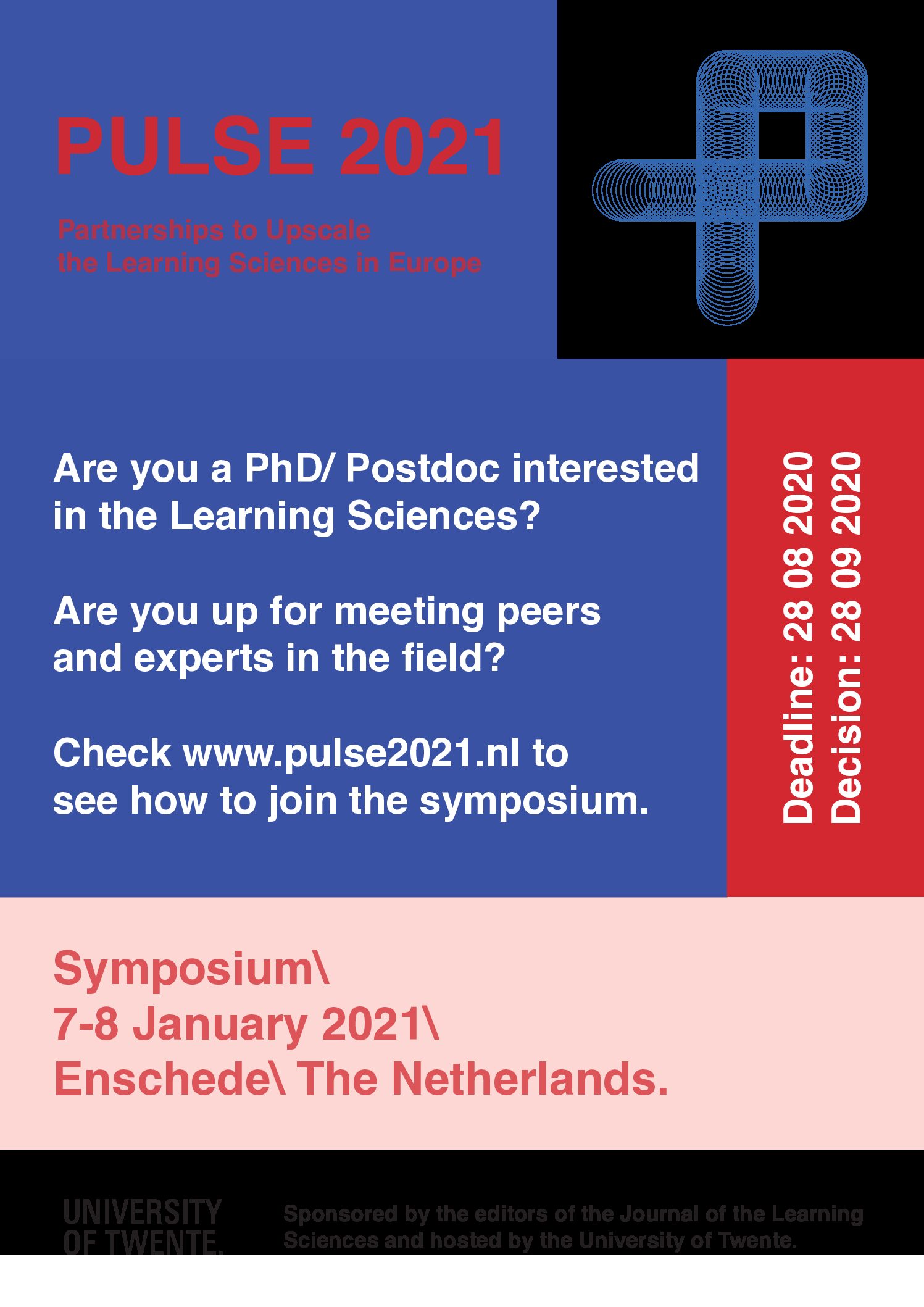 We are happy to invite you to participate in the PULSE-2021 symposium on the Learning Sciences that will take place on 7-8 January 2021 in Enschede, The Netherlands.