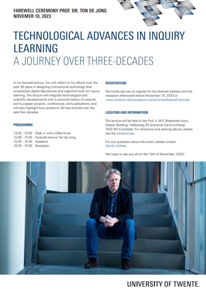 In his Farewell lecture, Professor Ton de Jong will reflect on his efforts over the past 30 years in designing instructional technology that emphasizes digital laboratories and cognitive tools for inquiry learning. The lecture will integrate technological and scientific developments with a personal history of national and European projects, conferences, and publications, and will also highlight how academic life has evolved over the past few decades.