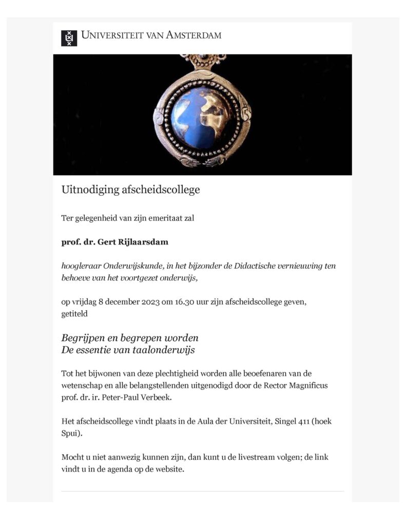 Op 8 december vier ik de eerste vijf jaar in emeritusstatus, of 42 jaar UvA. Zojuist hoorde ik dat ik na vijf jaar emeritus nog weer vijf jaar mag blijven, om as co-promotor promovendi te begeleiden, en met aanstaande promovendi plannen te maken, en zo meer, maar het leek me goed om nu ik nog uit mijn woorden kan komen dit punt te markeren, zodat ik langzaam en als vanzelf kan eclipseren uit de contreien van de UvA. Als je erbij wilt zijn, wees van harte welkom!