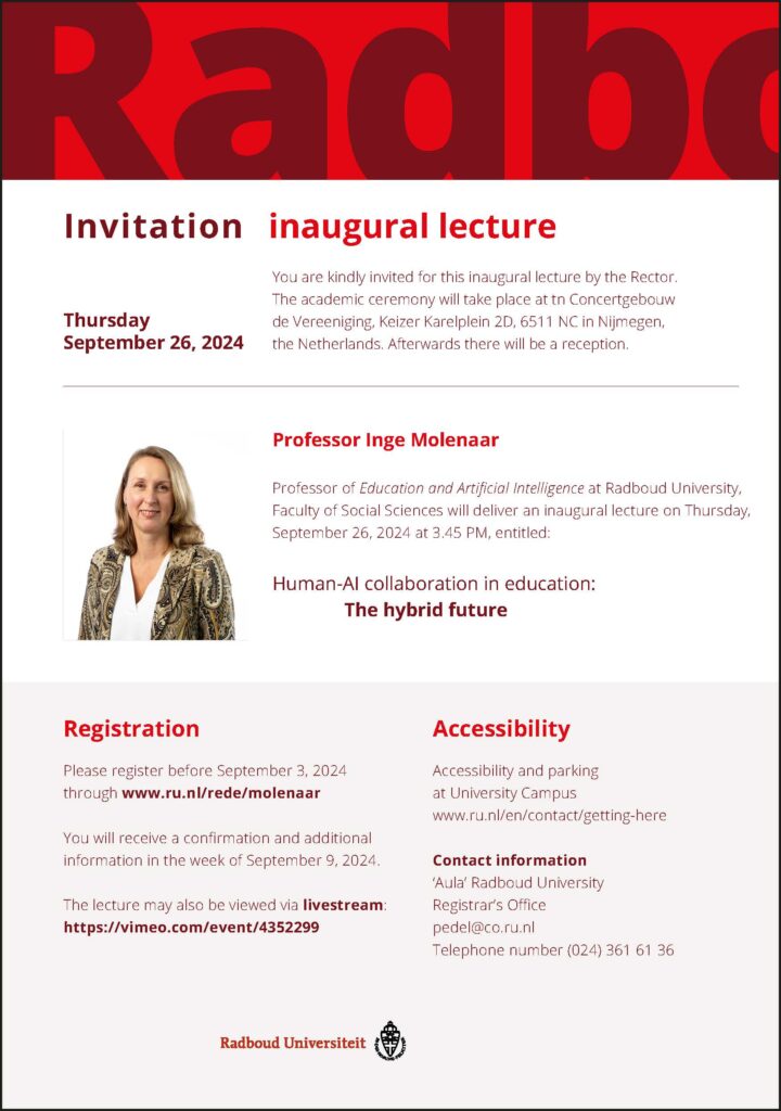 Professor of Education and Artificial Intelligence at Radboud University, Faculty of Social Sciences will deliver an inaugural lecture (in Dutch) on Thursday, September 26, 2024 at 3.45 PM, entitled: